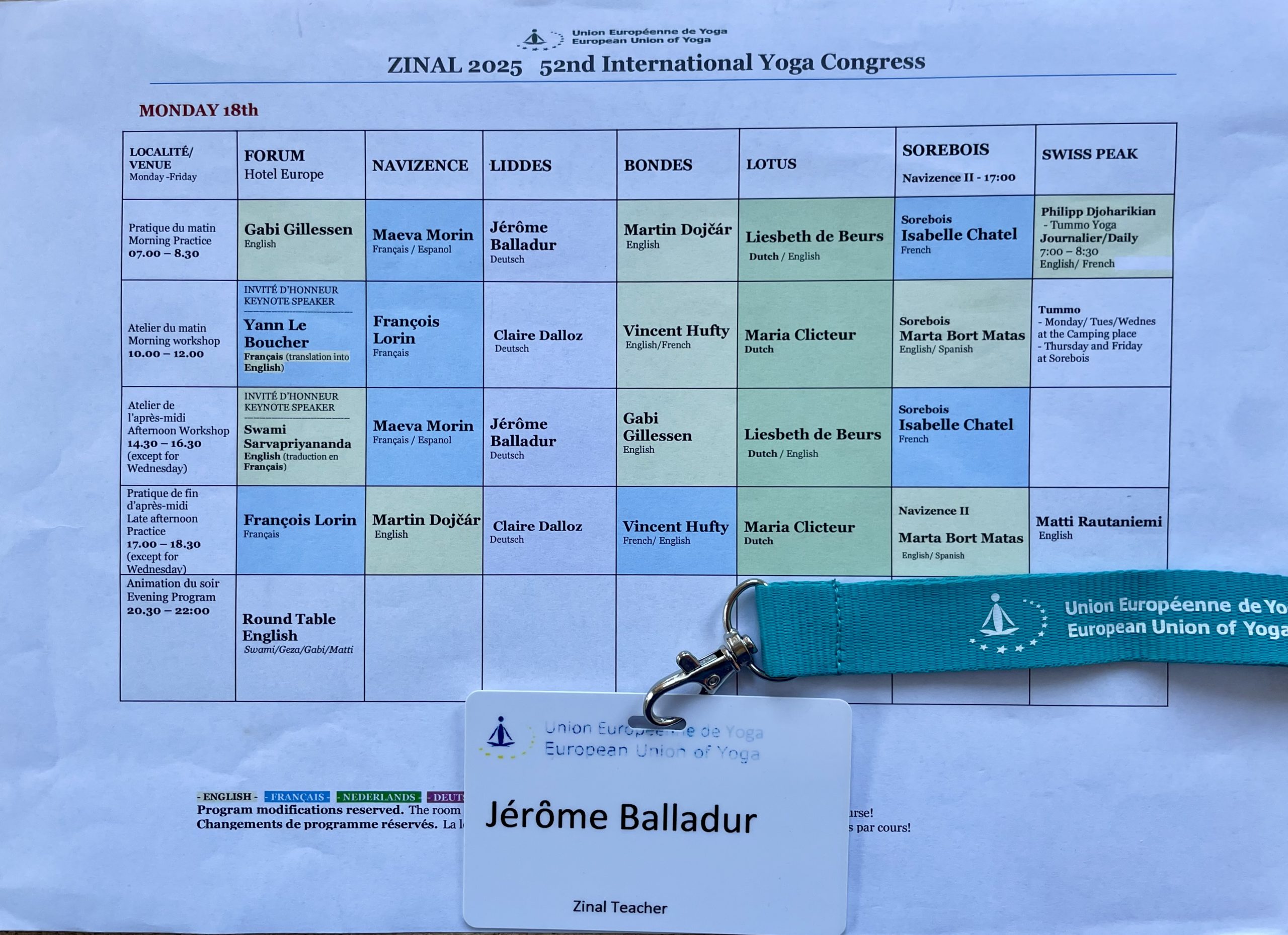 J´ai participé, comme chaque année, au congrès en tant que délégué de la fédération autrichienne de yoga BYO. Et cette année, celle-ci m´a fait l´honneur de me désigner comme enseignant. Les cours ont eu lieu de 7 h à 8 h 30 le matin, et de 14 h 30 à 16 h 30 l’après-midi. Ils ont réuni une trentaine de participants chaque jour, venus principalement d’Autriche, d’Allemagne et de Suisse, mais également de France, d’Ukraine, d’Israël, de Belgique, des Pays-Bas, de Slovaquie, de Hongrie et de Tchéquie.