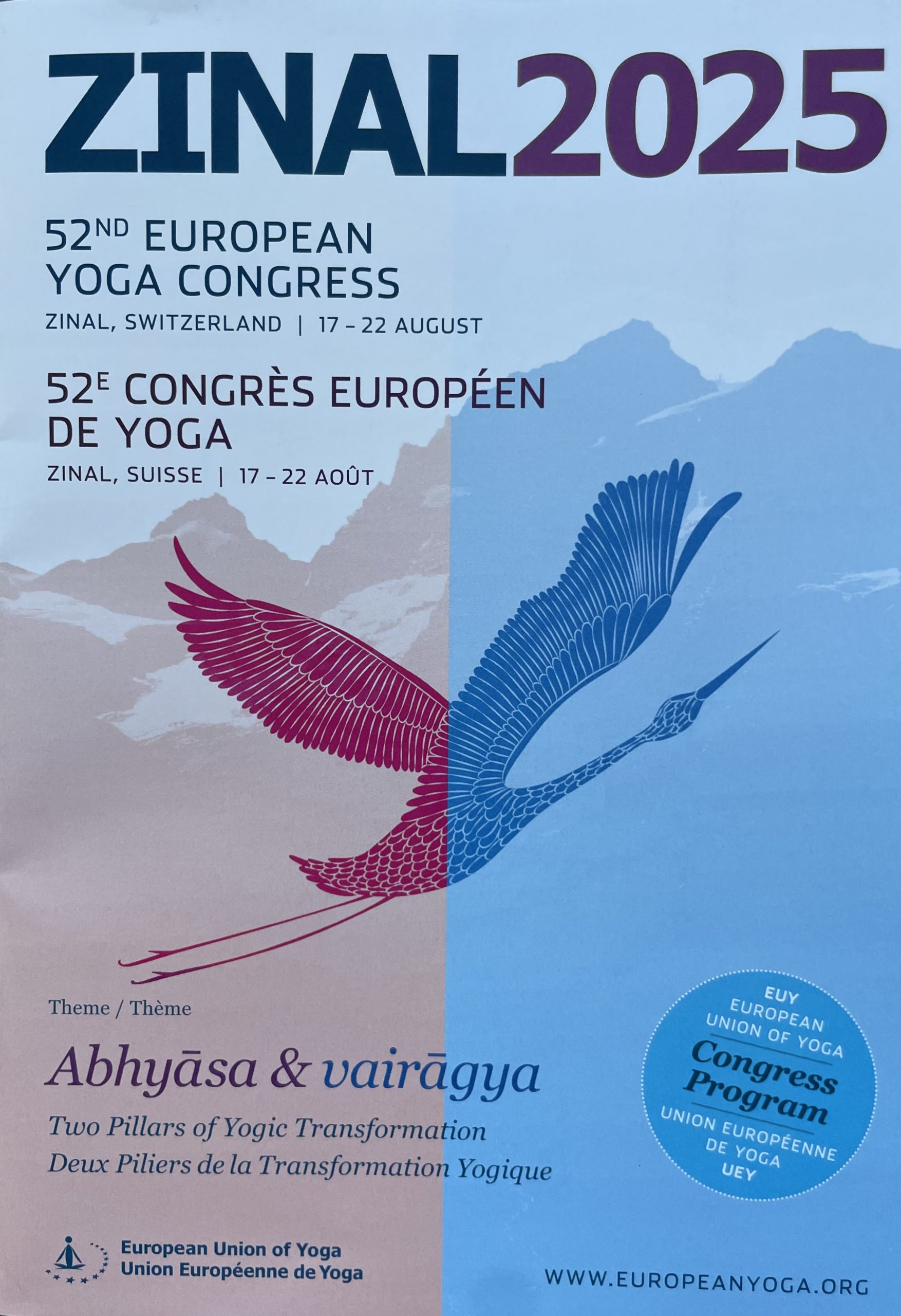 Le 52e congrès européen de yoga s’est tenu à Zinal, en Suisse, autour du thème « abhyāsa vairāghyā », pratique persévérante et lâcher-prise, exposé dans le premier chapitre des Yoga Sūtra de Patanjali. Celui-ci nous engage à pratiquer sans interruption, de manière prolongée, avec confiance et zèle. Alors la pratique devient une habitude de vie, aussi vitale que le fait de respirer ; et la volonté n´est plus nécessaire, l’attachement fond petit à petit.